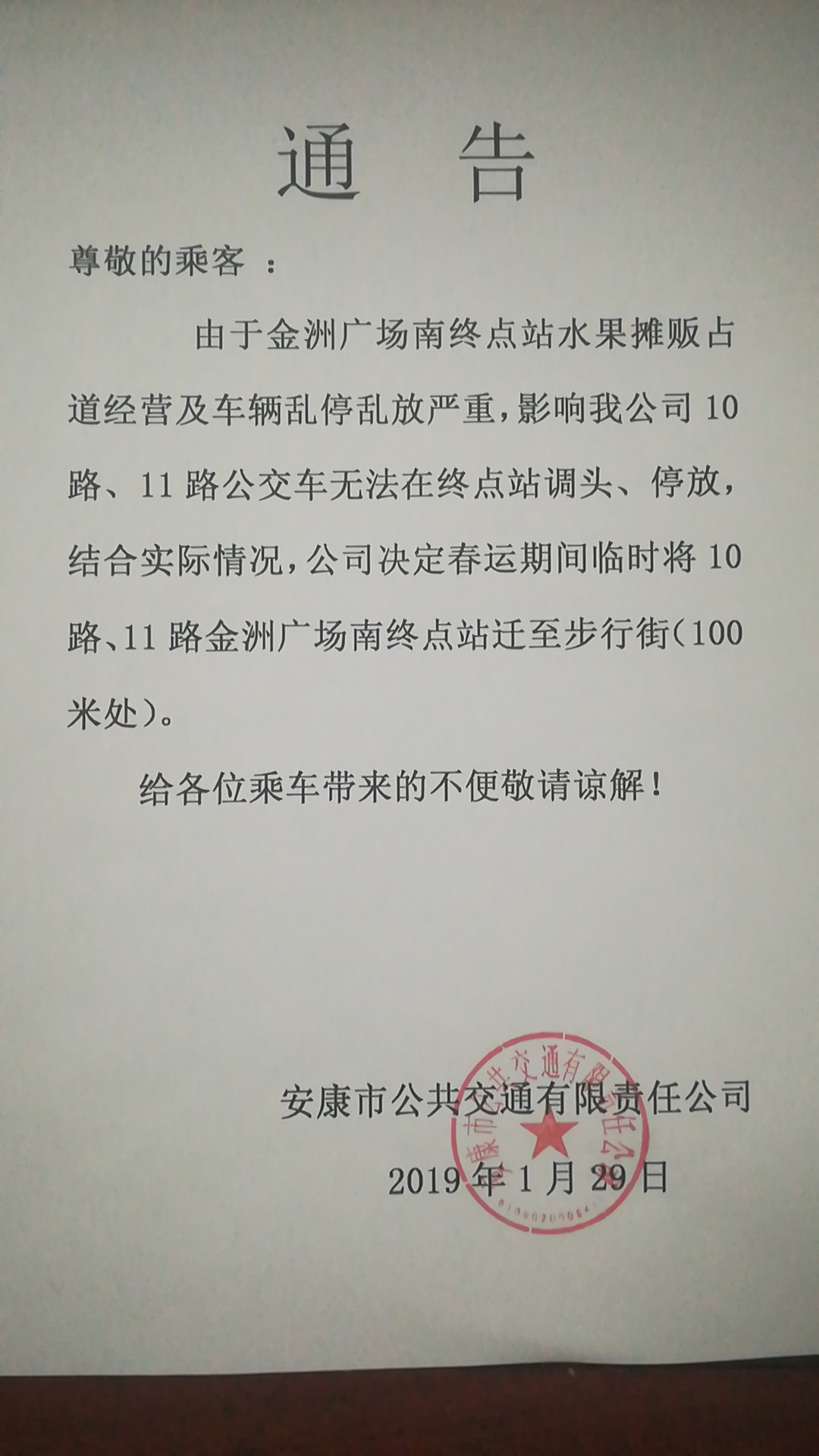 由于金洲廣場南終點站水果攤販占道經(jīng)營及車輛亂停亂放嚴(yán)重,影響我公司10路、11路公交車無法在終點站調(diào)頭、停放,結(jié)合實際情況,公司決定春運期間臨時將10路、11路金洲廣場南終點站遷至步行街(100米處)。